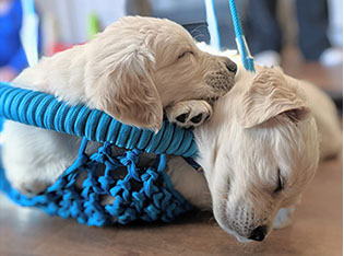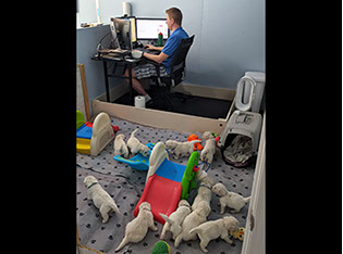During this time, we are looking at sociability, emotionality, problem solving ability, group dynamics, motor abilities, energy level, terrain test to ascertain the puppy's willingness to walk across various textures, response to environmental stimuli, touch sensitivity, following, restraint, social dominance, elevation dominance, retrieving, sound sensitivity, sight sensitivity, stability and structure and more. We typically find that temperament testing gives confirmation of the knowledge we have already gained about each puppy, and which show natural inclinations toward future assistance or career work. Although we are proponents of temperament testing, we realize it is not intended to predict future performance. Rather, it is used to evaluate a puppy's temperament at the time of testing that can help provide some predictive clues of what each dog's basic personality could be, and what type of home would be best suited for each puppy.