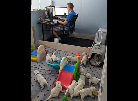 Once the puppies can hear (about 2 weeks of age), we start to play hundreds of random and common household sounds to help desensitize the puppies as much as possible. Getting them used to hearing all sorts of noises from the start is important.